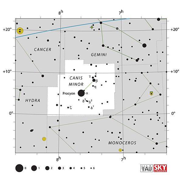 작은개자리의 알파별 프로키온은 겉보기 등급이 0.34로 밤하늘에서 8번째로 밝은 별입니다.