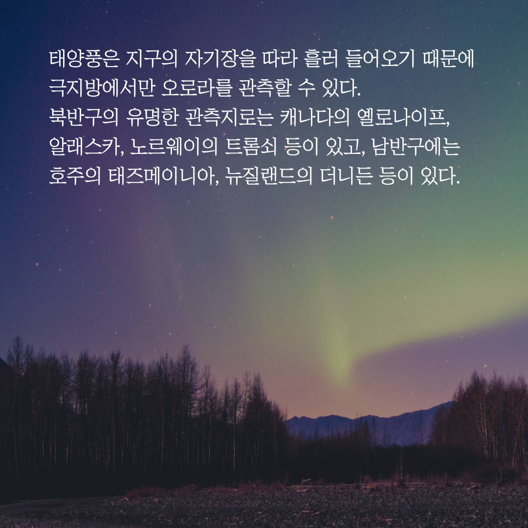 태양풍은 지구의 자기장을 따라 흘러 들어오기 때문에 극지방에서만 오로라를 관측할 수 있다.