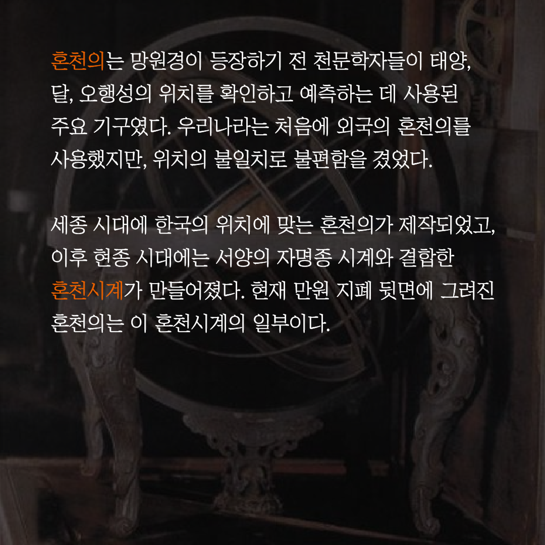 현재 만원 지폐 뒷면에 그려진 혼천의는 이 혼천시계의 일부이다.
