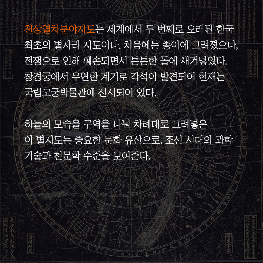 천상열차분야지도는 세계에서 두 번째로 오래된 한국 최초의 별자리 지도이다.