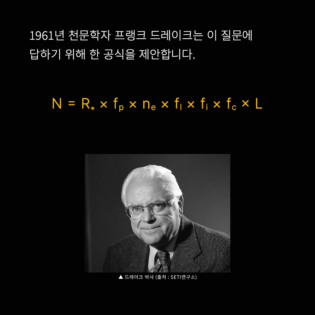 1961년 천문학자 프랭크 드레이크는 이 질문에 답하기 위해 한 공식을 제안합니다.