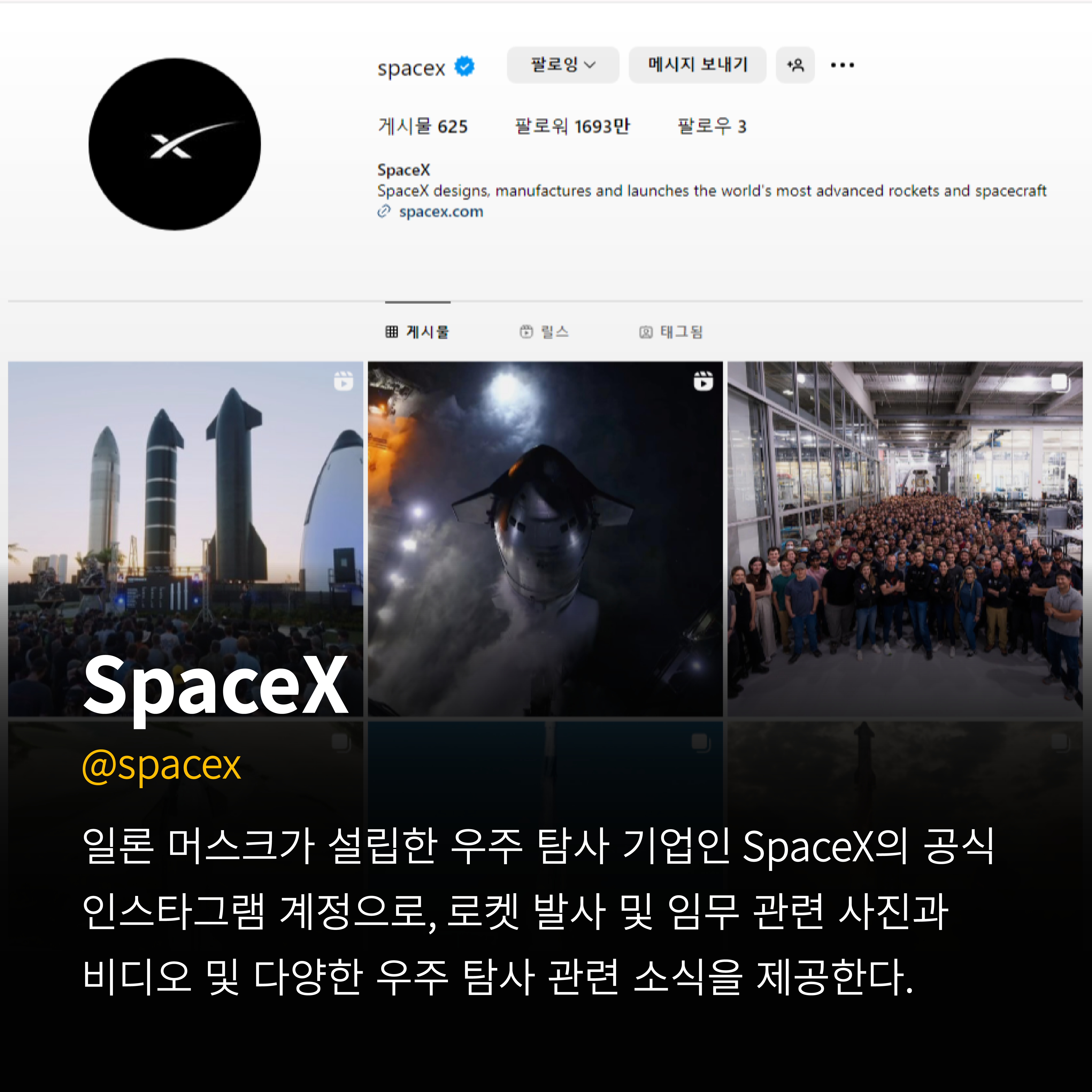 일론 머스크가 설립한 우주 탐사 기업인 SpaceX의 공식 인스타그램 계정으로,