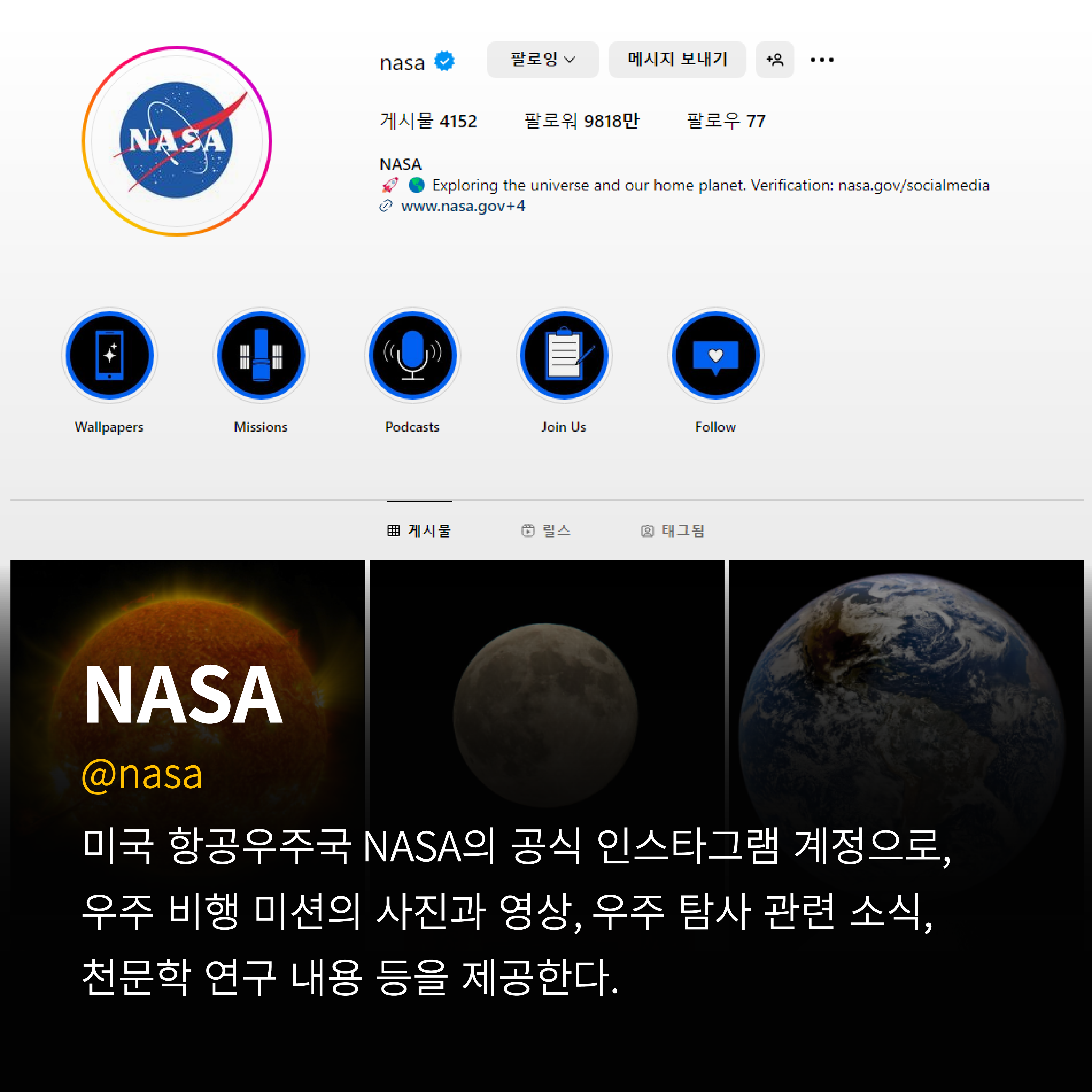 미국 항공우주국 NASA의 공식 인스타그램 계정으로, 우주 비행 미션의 사진과 영상,