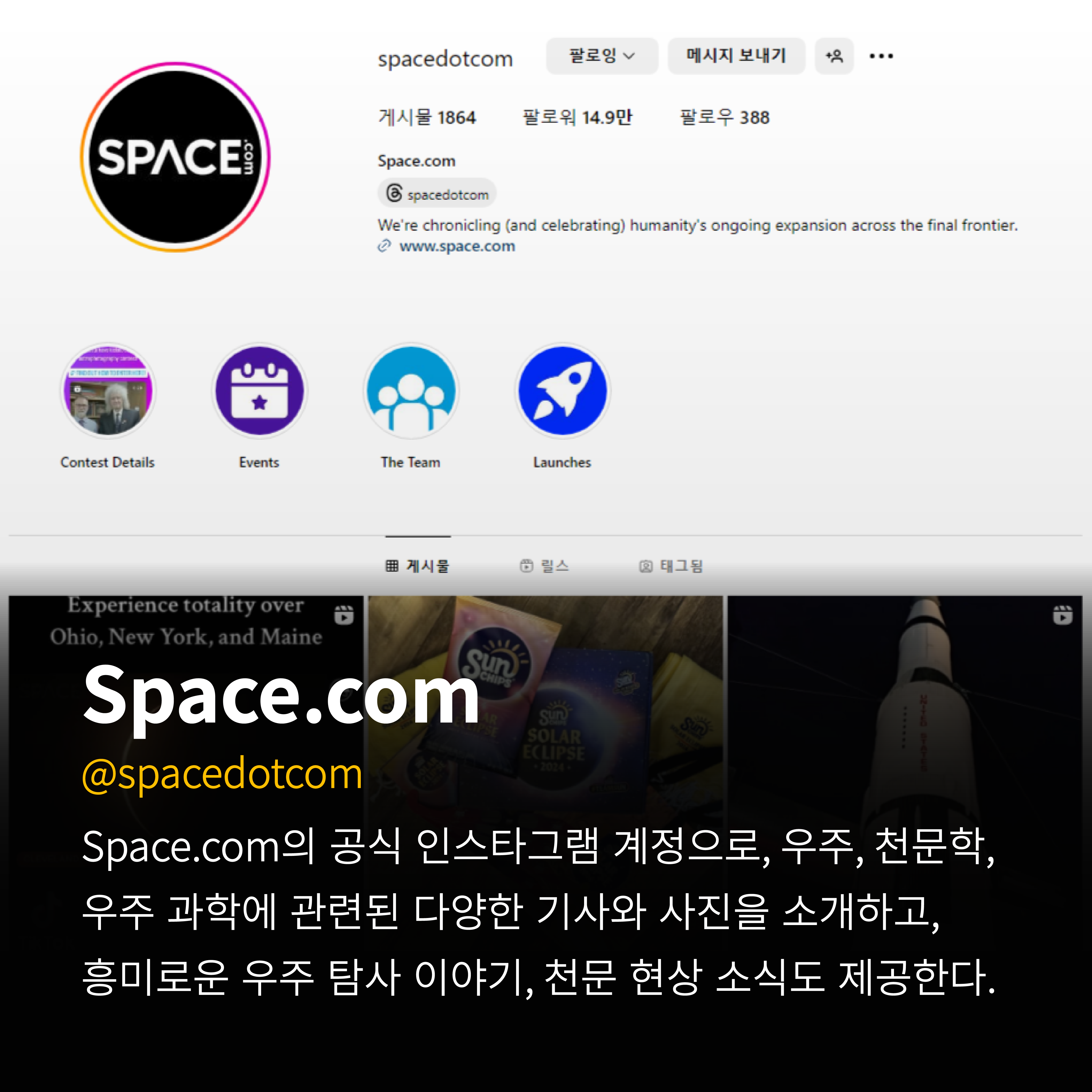 space.com의 공식 인스타그램 계정으로, 우주, 천문학, 우주 과학에 관련된 다양한 기사와 사진을 소개하고,