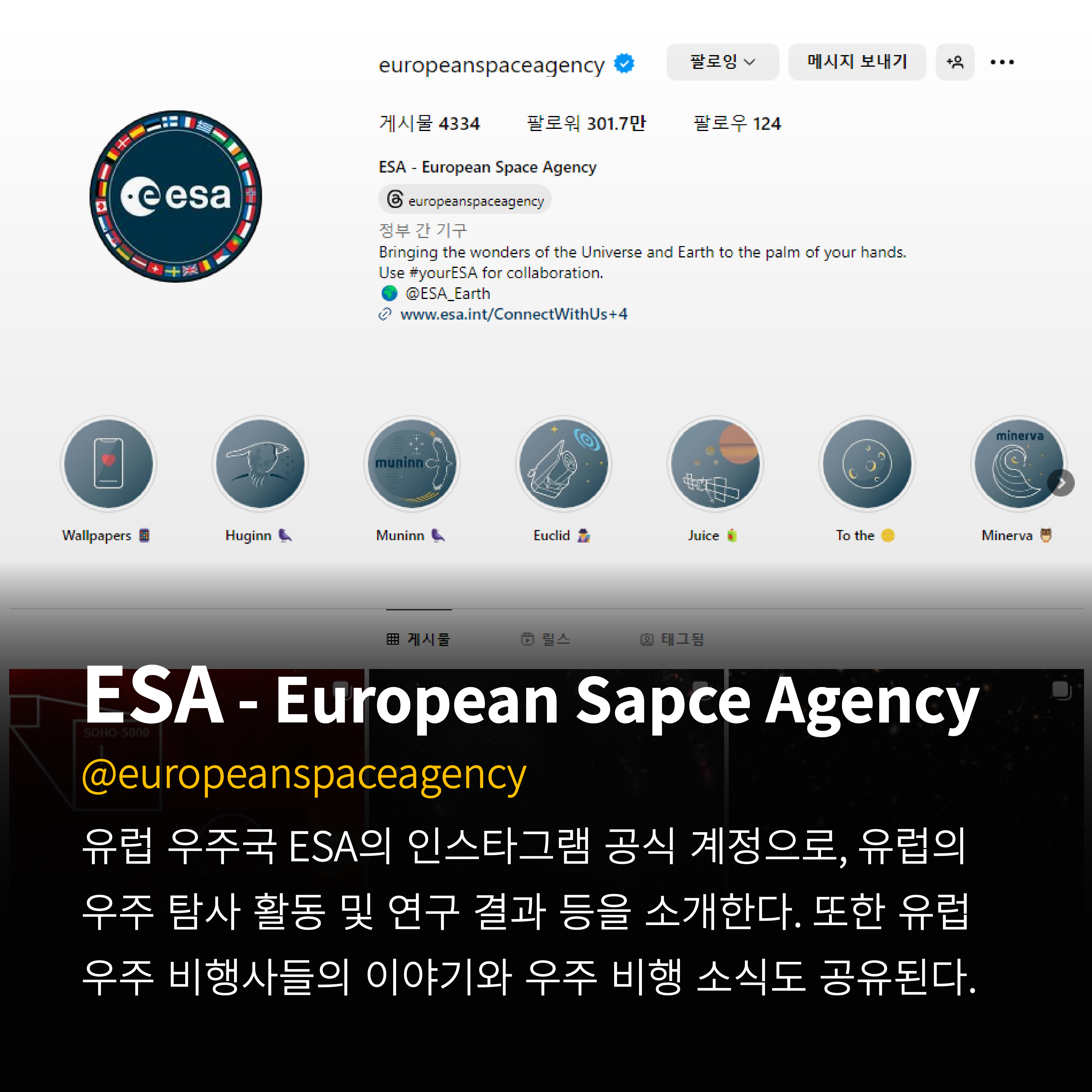유럽 우주국 ESA의 인스타그램 공식 계정으로, 유럽의 우주 탐사 활동 및 연구 결과 등을 소개한다.