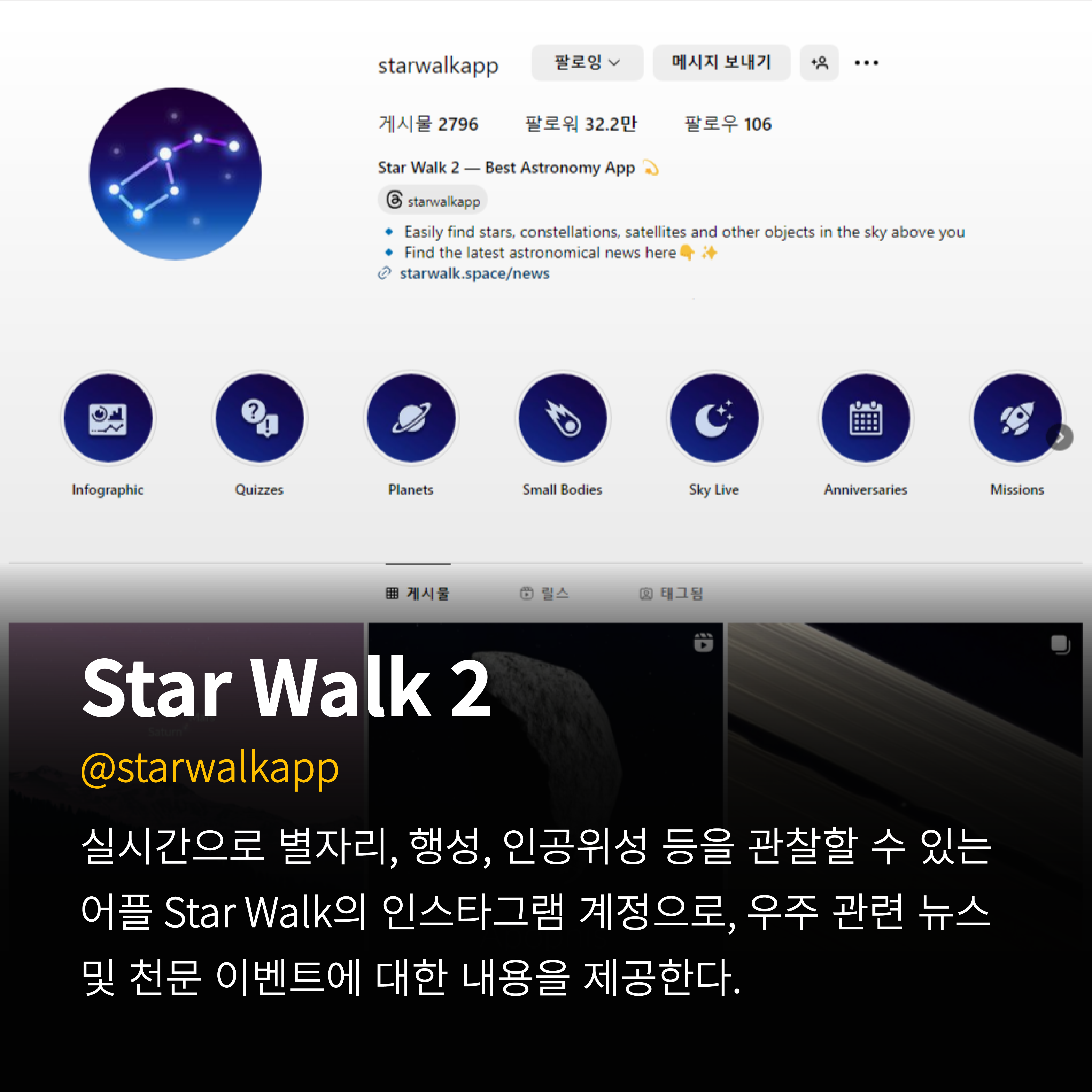 실시간으로 별자리, 행성, 인공위성 등을 관찰할 수 있는 어플 Star Walk의 인스타그램 계정으로,