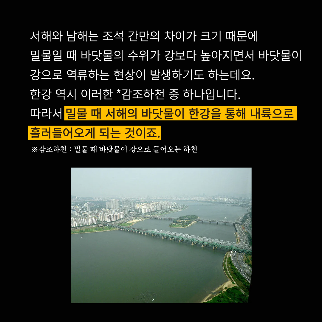 따라서 밀물 때 서해의 바닷물이 한강을 통해 내륙으로 흘러들어오게 되는 것이죠.