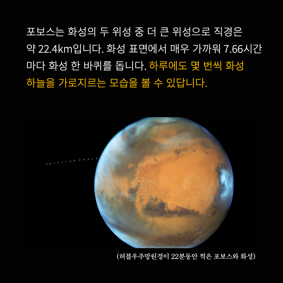 포보스는 화성의 두 위성 중 더 큰 위성으로 직경은 약 22.4km입니다.