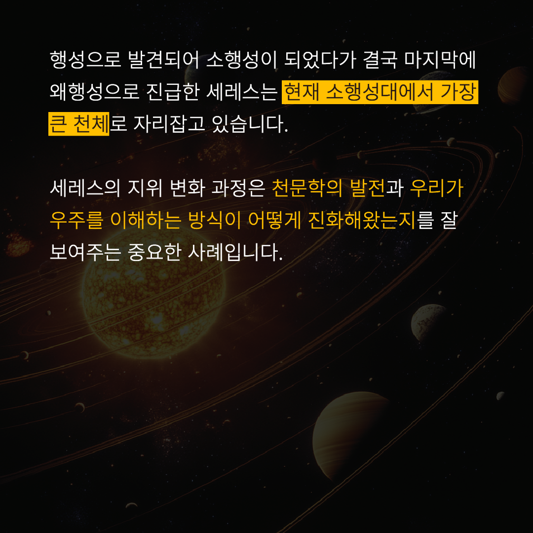세레스의 지위 변화 과정은 천문학의 발전과 우리가 우주를 이해하는 방식이 어떻게 진화해왔는지를 잘 보여주는 중요한 사례입니다.