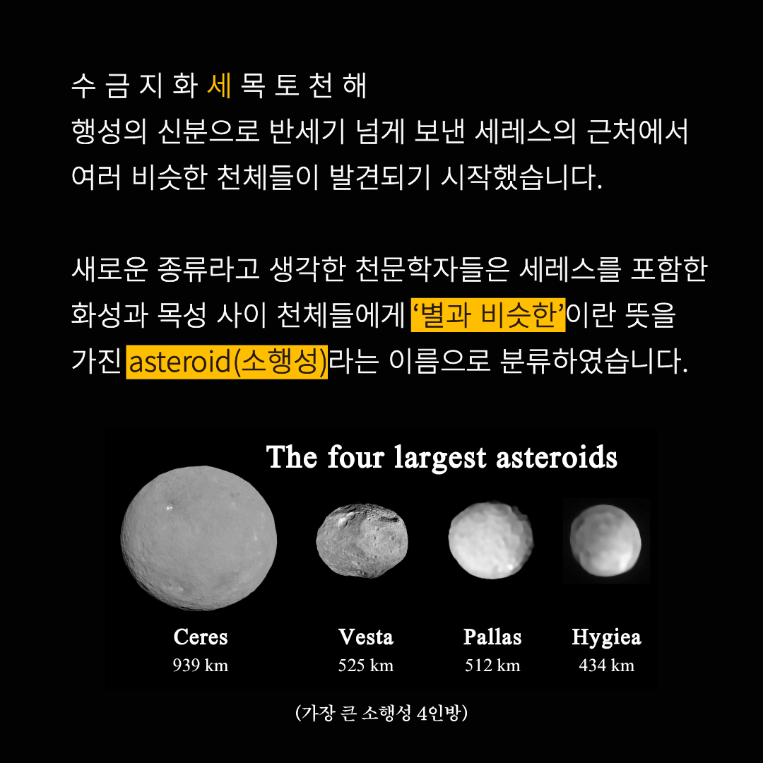 새로운 종류의 천체라고 생각한 천문학자들은 세레스를 포함한 화성과 목성 사이 천체들에게 ‘별과 비슷한’이란 뜻을 가진 asteroid(소행성)이라는 이름으로 분류하였습니다.